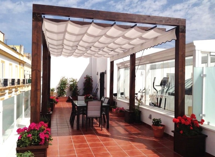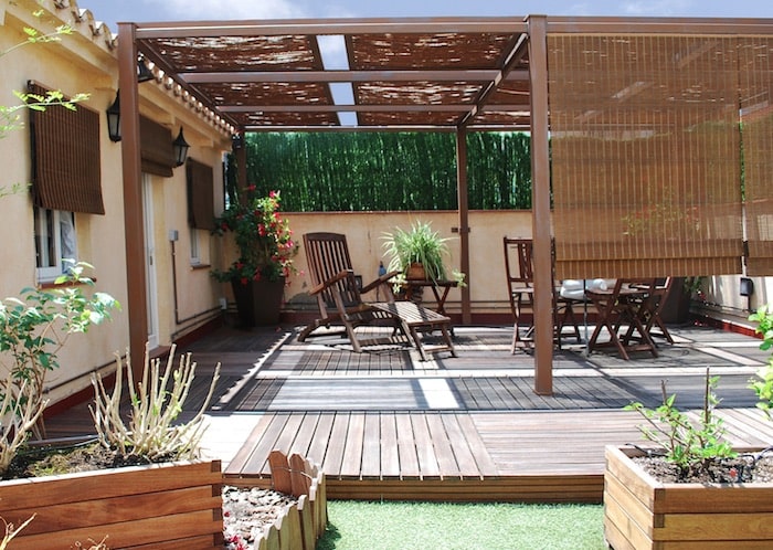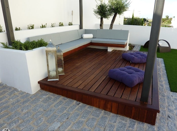 Podemos projetar nosso terraço com os materiais e acessórios que mais gostamos e incorporar os elementos rústicos em pequenas escala. Na imagem você pode ver a madeira no chão e o paralelepípedo que rodeia esta maravilhosa composição.