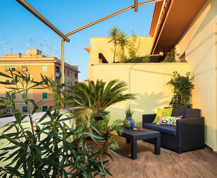 Um terraço rústico deve ter sempre na sua decoração acessórios naturais como plantas, acompanhados de materiais nobres como barro, pedra, madeira ou vime.
