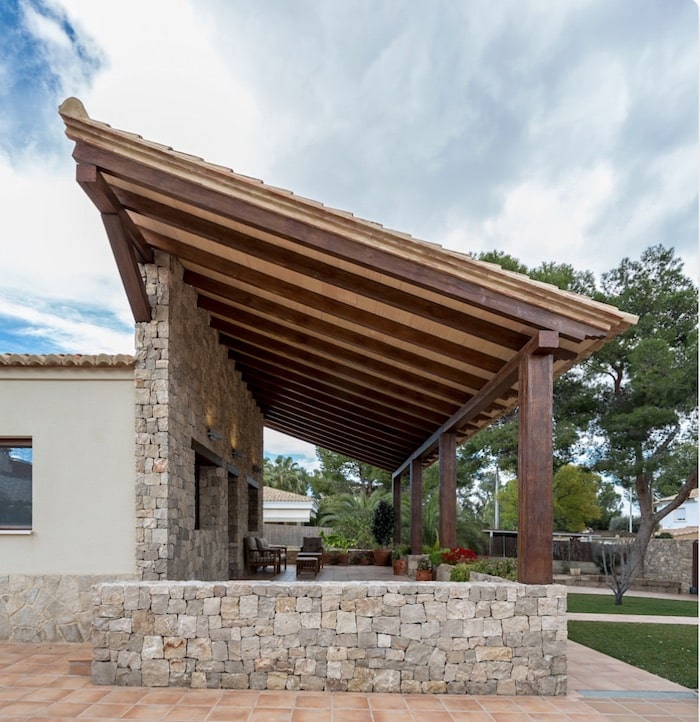 Não importa se sua casa é moderna ou colonial, uma das vantagens oferecidas por este tipo de terraço rústico é que você pode perfeitamente misturar materiais. É assim que na foto você pode ver um muro de pedra, com um teto de madeira e bambu, contrastando com uma moderna sala branca que certamente sempre estará na moda.