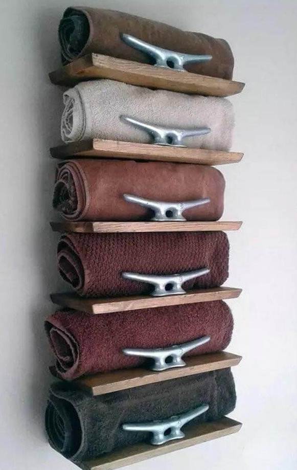 Você nunca pode ter muitas barras de toalha (bem, talvez você possa). Instale três barras de toalhas empilhadas na porta, uma área raramente usada, para colocar as toalhas sobre elas.