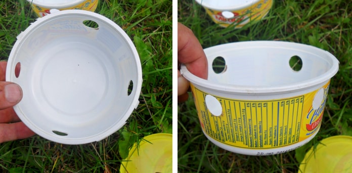 Coloque o que mais te convém dentro deste pote de manteiga, coloque em lugares estratégicos onde você sabe que tem lesmas e caracóis rondando pela noite e coloque a tampa com algum peso em cima.