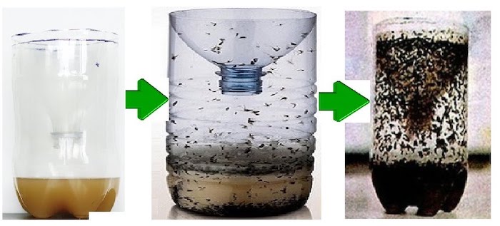 Os mosquitos são atraido pelo cheiro do vinagre e entram pelo gargalo mas não conseguem achar o caminho de volta e ficam presas.