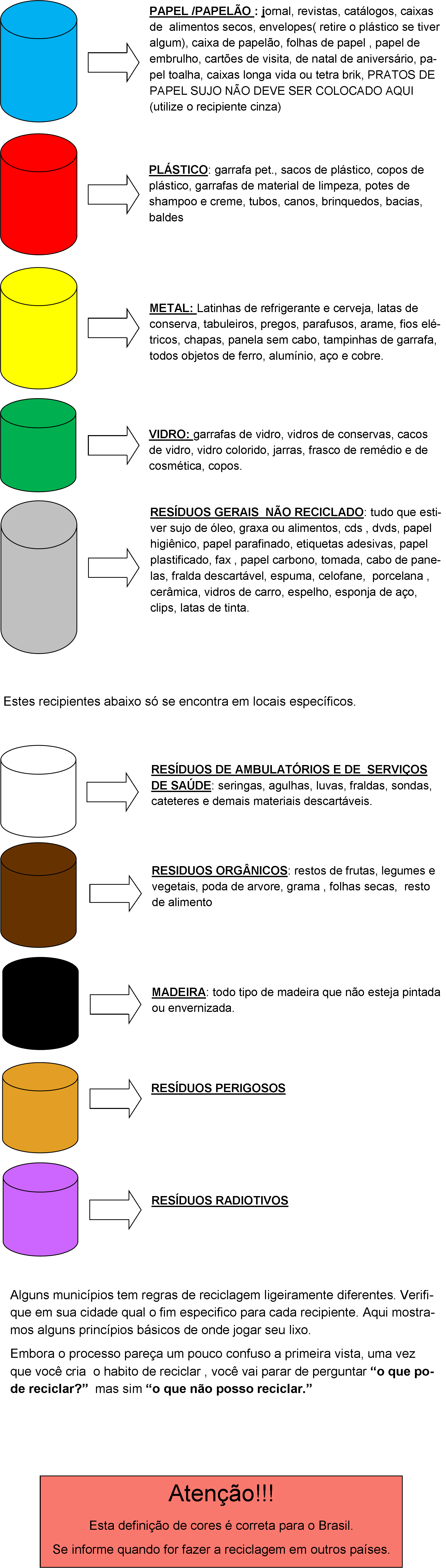 Muitas vezes….a maioria das vezes…….vamos colocar o lixo para reciclar e ficamos em dúvida ou não sabemos em qual deles porque não está escrito que tipo de material devemos inserir dentro. Muitas pessoas ainda não tem o hábito de reciclar os objetos descartados e por isso não entrou ainda na “rotina cerebral” o significado das cores de que cada recipiente representa.