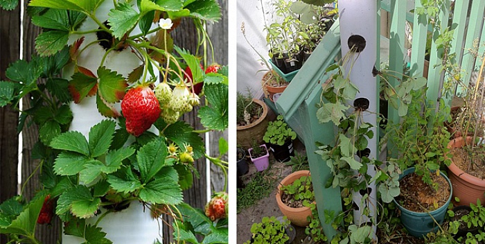 - Morangos são uma otima opção para plantar nestes tubos.