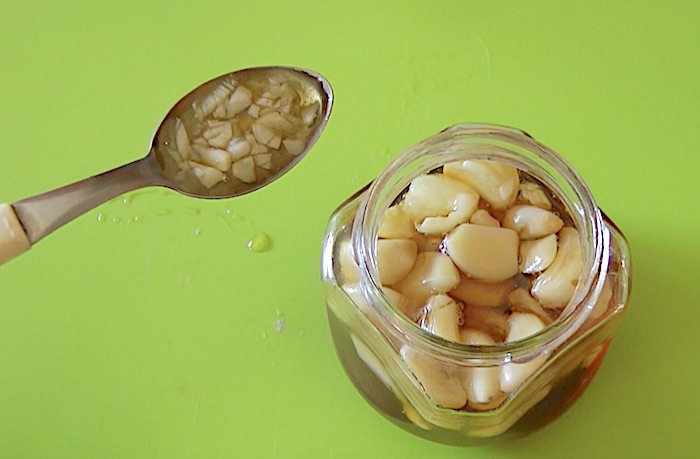 - Despeje o mel no frasco de vidro e adicione o alho picado.