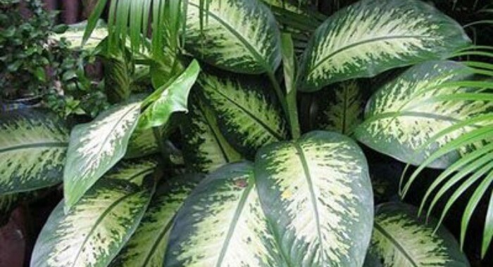 Outra planta de casa muito atraente, com grandes folhas brancas pontilhadas que crescem em um caule reto, é Dieffenbachia. É nativa dos trópicos e é cultivada como planta ornamental.