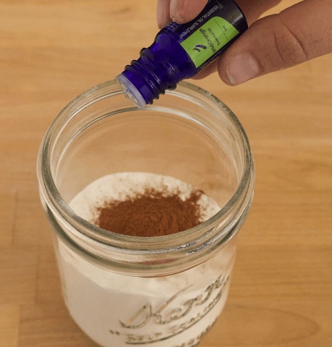 Adicione cerca de 30 gotas do (s) seu (s) óleo (s) essencial (is) da sua escolha. Se você não tem óleos essenciais à mão, pode adicionar uma colher de chá de canela ou cravo moído para aromatizar. Ou você pode fazer como nós fizemos e combinar os dois! Nós usamos cerca de 20 gotas de óleo essencial de laranja doce e 1 colher de chá de canela em pó. Acabou cheirando como bolo de laranja caseiros – humm!)