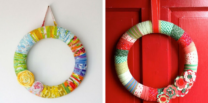 Materiais – guirlanda de Espuma (ou isopor) circular, 33 cm de diametro ( o tamanho é do gosto pessoal) – 10-20 tiras de tecido – velcro ou fita adesiva – Tesouras