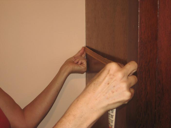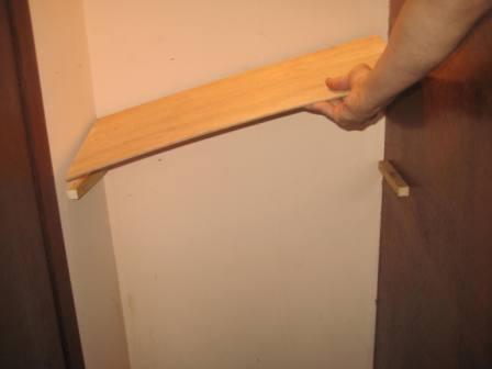 Neste exemplo um dos lados é a parede e o outro lado é a lateral do armário. Portanto vamos pregar um toquinho do lado do armário .