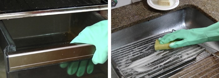 Para limpeza mais pesada de alimentos que ficaram grudados nas prateleiras ( veja o vídeo deste passo a passo)