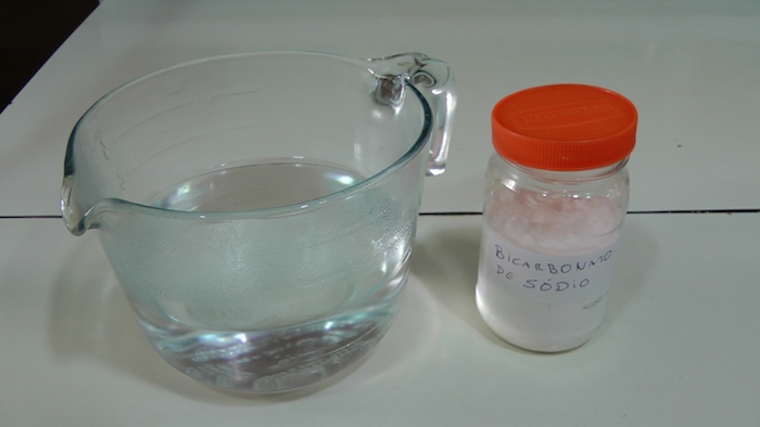2 – Em um recipiente, colocar uma quantidade generosa de bicarbonato e ir agregando água quente, bem devagar, até conseguir uma pasta.