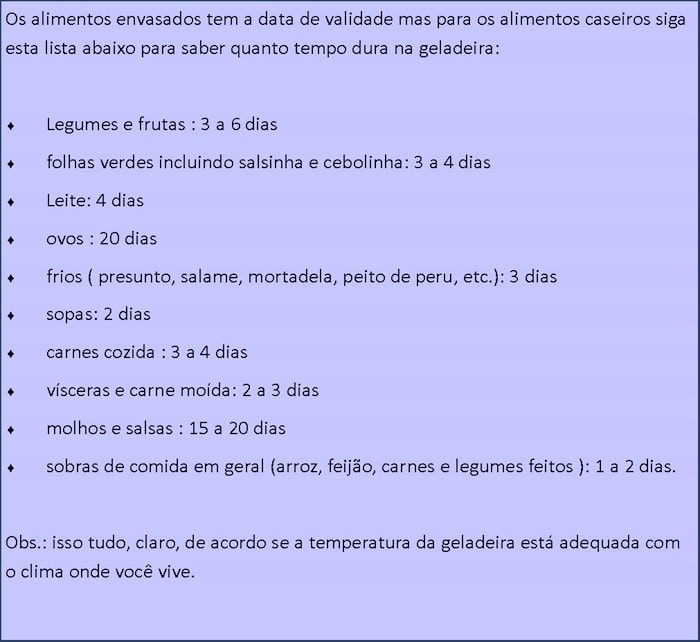Não seja indeciso na hora de jogar fora coisas que você nunca usa como a geleia ou o pickles que fica anos e anos na parte detrás da geladeira e deve ir direto para o lixo ou ao menos que você queira correr um serio risco de ter uma grave intoxicação. Veja abaixo, o quadro de validade dos alimentos dentro da geladeira