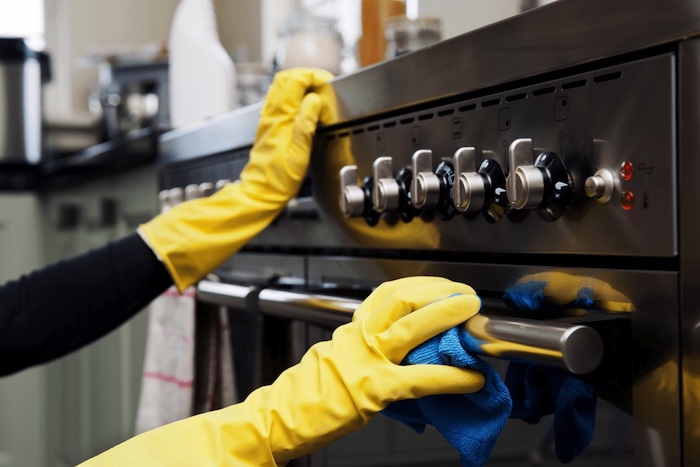 - Na manhã seguinte, ventile bem a área e, usando luvas, limpe a gordura solta com uma esponja ou pano.