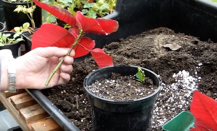 As estacas de poinsétias devem ser caules novos e saudáveis, cortados de plantas vigorosas. As hastes antigas que floresceram este ano não são as melhores estacas a serem usadas. Podar estas hastes para permitir que um novo broto se desenvolva.