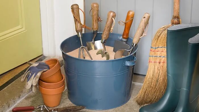Um vaso de terracota com uma mistura de areia e óleo mineral é o lar perfeito para suas pequenas ferramentas de jardinagem.