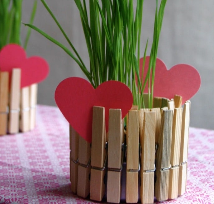 3 – Cortar corações de papel cartolina . Encaixar entre os prendedores de roupa. Estes vasos delicados são lindos como uma decoração de primavera.