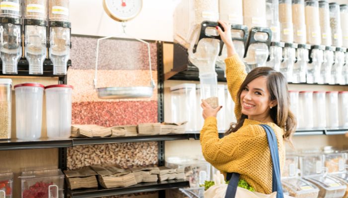 Em lojas a granel, você pode levar seus próprios recipientes para encher com alimentos, evitando as embalagens plásticas. Essa prática também permite que você compre a quantidade exata que precisa, reduzindo o desperdício de alimentos.
