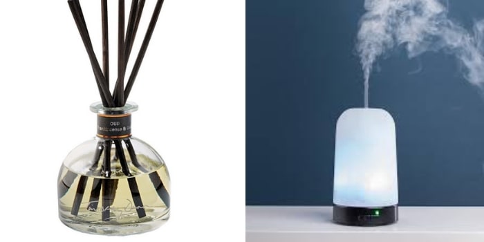 Eu adoro difusores porque é muito fácil de usar! Basta enchê-lo com água, despeje algumas gotas do óleo essencial ou de uma mistura de óleos essenciais que desejar e pronto. O difusor cria uma névoa fina que carrega o cheiro dos óleos essenciais em toda a sua casa. As varetas também são uma excelente opção. Veja AQUI algumas misturas de óleos essenciais que são perfeitas para um difusor na sua casa.
