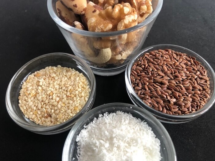 Agora basta juntar as castanhas trituradas com as sementes trituradas.