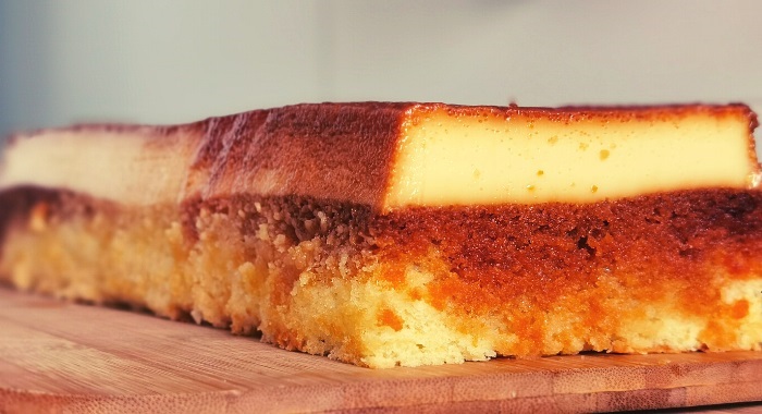 Uma mistura de bolo e pudim que é assado no forno um em cima do outro ao mesmo tempo, sem que as camadas se misturem, É muito fácil e rápido de preparar, demora apenas 20 minutos no forno e 40 minutos no forno.