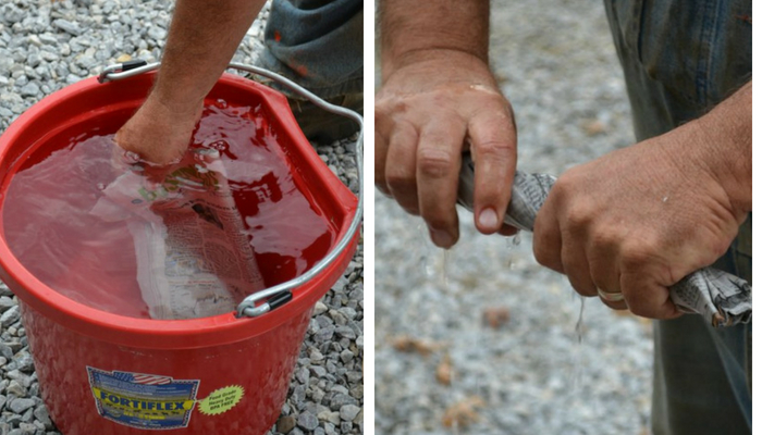 O que você deve fazer é mergulhar as estacas nesta mistura de água + enraizador por 1 hora. Em seguida, Mergulhe várias folhas de jornal em um balde de água, deixando o completamente empapado. Torça o jornal para retirar o excesso de água.