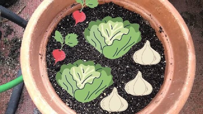 Em outro vaso, pode plantar alfaces junto com alhos e rabanetes-