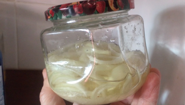 Corte meia cebola em fatias finas. Coloque uma camada fina de cebola e polvilhar açúcar. Faça camadas de cebola com açúcar até atingir meio pote . Misture bem porque a cebola deve ficar completamente “empanada” no açúcar . Após isso, feche a tampa do vidro.