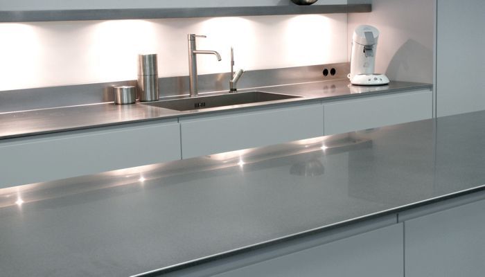 Se você limpar aço inoxidável corretamente é fácil de manter. Mas, quanto mais você deixe um respingo ou derramamento, torna-se mais difícil para limpar. Você pode limpar bancadas de aço inoxidável com um pouco de água e sabão, ou com um produto feito especificamente para esta superfície. O aço inoxidável também mostra impressões digitais e manchas de água facilmente, então não é o ideal para uma casa com crianças pequenas.